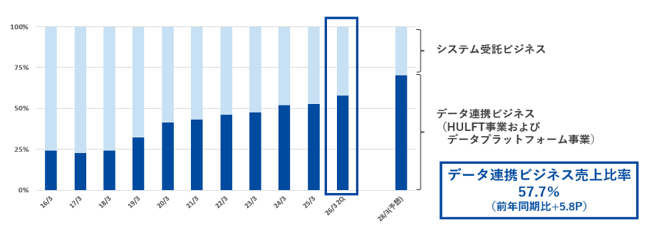 「4つのシフト」のうち、「事業シフト」では、事業構造の変革を進め、データ連携ビジネスの拡大を進めております。2026年3月期上半期においては、57.7%まで拡大いたしました。(前年同期比5.8pt増加)